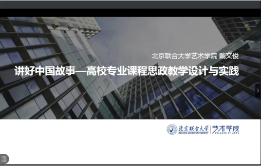 而后,北京联合大学艺术学院戴文俊老师作了《讲好中国故事——高校专业课程思政教学设计与实践》专题报告。报告从课程思政的起源与实践、专业课程思政教学设计和课程思政教学设计展示三个方面展开。内容重点涉及如何挖掘中国故事、如何提炼课程思政元素、思政元素如何融入专业课程。戴老师认为课程思政建设不是增开一门课,也不是去课程思政化或者课程去知识化,而是对专业内容、方法的重新挖掘和认识,通过梳理专业课程中蕴含的思政元素,融入课堂教学各个环节,实现立德树人润物无声。要回归初心,教育者没有捷径可言,一定要花费更多的精力做到:讲好一门课,讲一门好课。