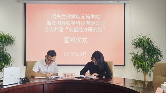 9月22日下午,学院与浙江图胜数字科技有限公司合作共建“东盟经济研究院”签约仪式在图书馆813会议室举行。学院院长沈红卫等学院领导班子成员与浙江图胜数字科技有限公司总经理吴代君女士一行出席签约仪式,学院相关部门负责人参加仪式。仪式由学院副院长周思红主持。
