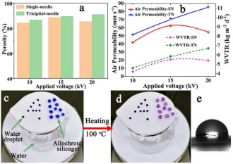 在此基础上,作者自行开发一种可改善电场分布的三叉针头式喷嘴,通过电场模拟和实验的方法深入探索由喷嘴装置诱导的电场分布对射流运动、纤维形貌及纤维集合体性能的影响,发现设计的新型喷嘴装置不仅能够增加纤维的产量,均匀的电场分布还赋予纤维膜优良的性能,如7 MPa的拉伸应力和401%的断裂伸长率,85.32 mm s-1的透气性,及良好的防水透湿性能(图2。该研究通过喷嘴结构的设计改善了传统喷嘴极为不匀的电场分布,制备出更为均匀的纤维,提高了TPU纤维膜的机械性能及防水透湿透气性能。相关研究成果以“Effect of improved electric field distribution on jet motion, fiber morphology, and properties of electrospun thermoplastic polyurethane fibrous membrane”为题在中科院3区,影响因子3.1,国际期刊《Polymer for advanced technologies》发表。