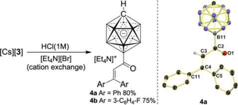 随后,利用中间体2与二苯基甲酮反应,成功合成了一系列碳硼烷基炔丙醇衍生物3。进一步通过加入盐酸,经过Meyer-Schuster重排,生成目标产物α,β-不饱和羰基化合物4。这一反应过程展示了碳硼烷阴离子在构建复杂有机分子中的潜力,为相关领域的研究提供了新的思路。