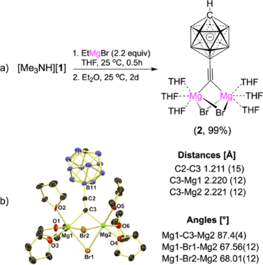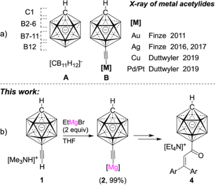 首先,以炔基碳硼烷1为原料,与格式试剂EtMgBr反应,生成碳硼烷炔基镁中间体2,并通过核磁和单晶衍射首次解析其结构。这一研究首次报道了碳硼烷炔基镁的单晶结构,为该类化合物的结构研究提供了重要参考