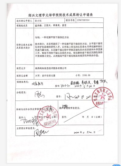 经教师申报,科研与对外合作处审核,“一种花瓣平面干燥保色方法”专利拟转让。内容详见附件,现予以公示,公示时间为十五天(5月22日 — 6月 6 日)。公示期间,如有异议,请及时与我处联系。