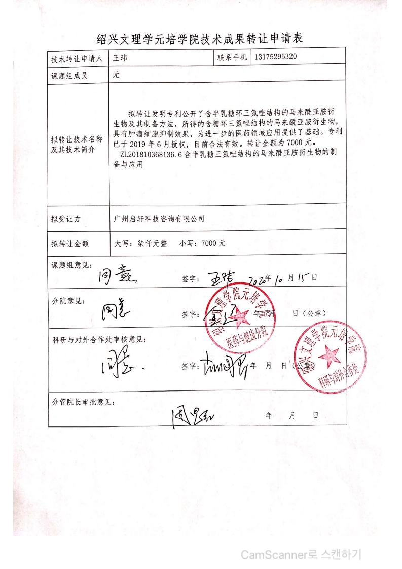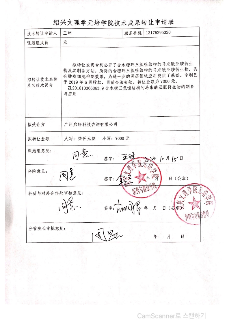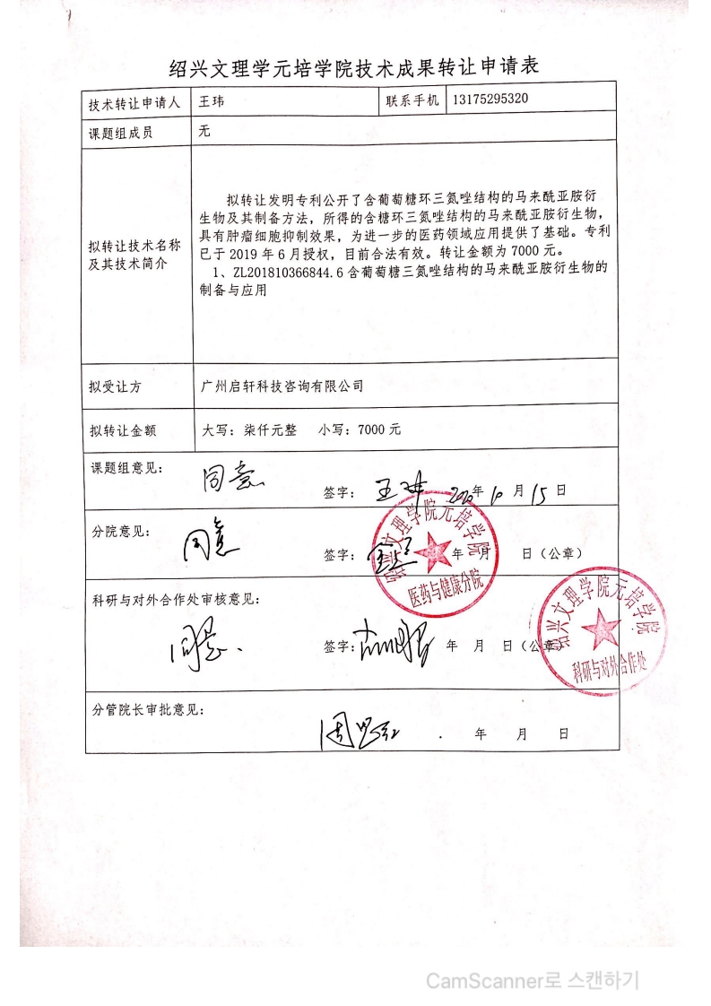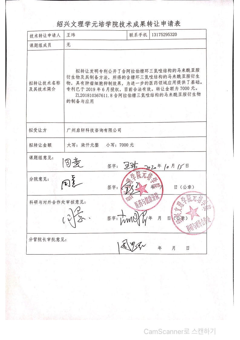 经教师申报,科研与对外合作处审核,“含葡萄糖三氮唑结构的马来酰亚胺衍生物及其制备方法与应用”、“含木糖三氮唑结构的马来酰亚胺衍生物及其制备方法与应用”、“含阿拉伯糖三氮唑结构的马来酰亚胺衍生物及其制备方法与应用”、“含半乳糖三氮唑结构的马来酰亚胺衍生物及其制备方法与应用”专利拟转让。内容详见附件,现予以公示,公示时间为十五天(10月16日—10月30日)。公示期间,如有异议,请及时与我处联系。联系人:陆唯,联系电话:88347834,图书馆706室。