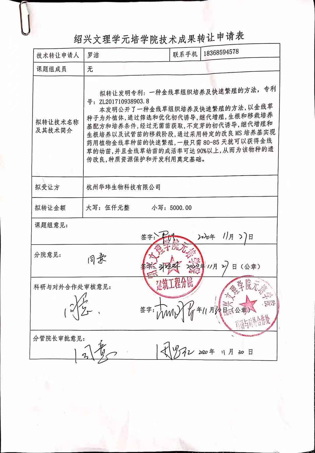 经教师申报,科研与对外合作处审核,“一种金线草组织培养及快速繁殖的方法”专利拟转让。内容详见附件,现予以公示,公示时间为十五天(11月30日 — 12月 14日)。公示期间,如有异议,请及时与我处联系。