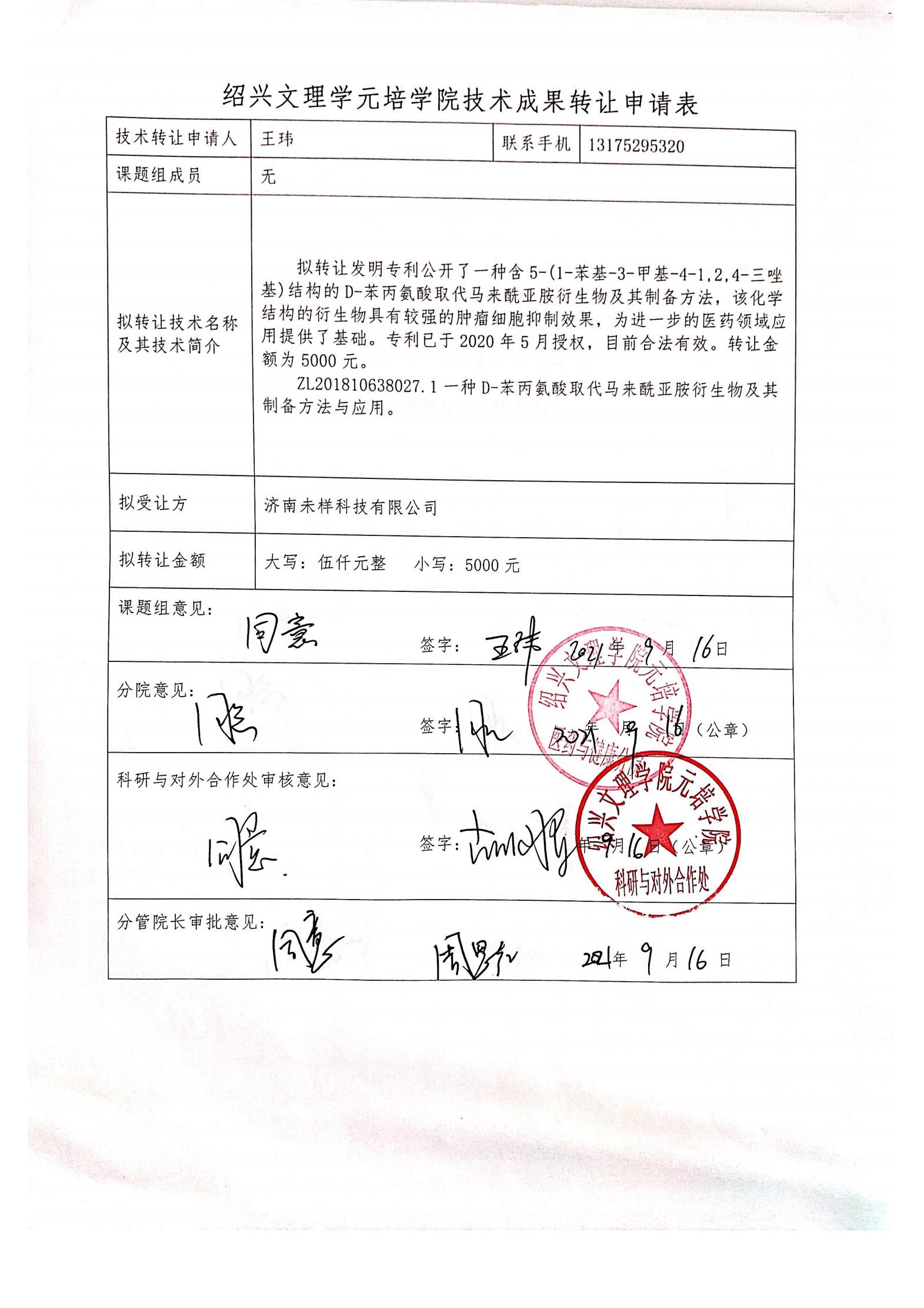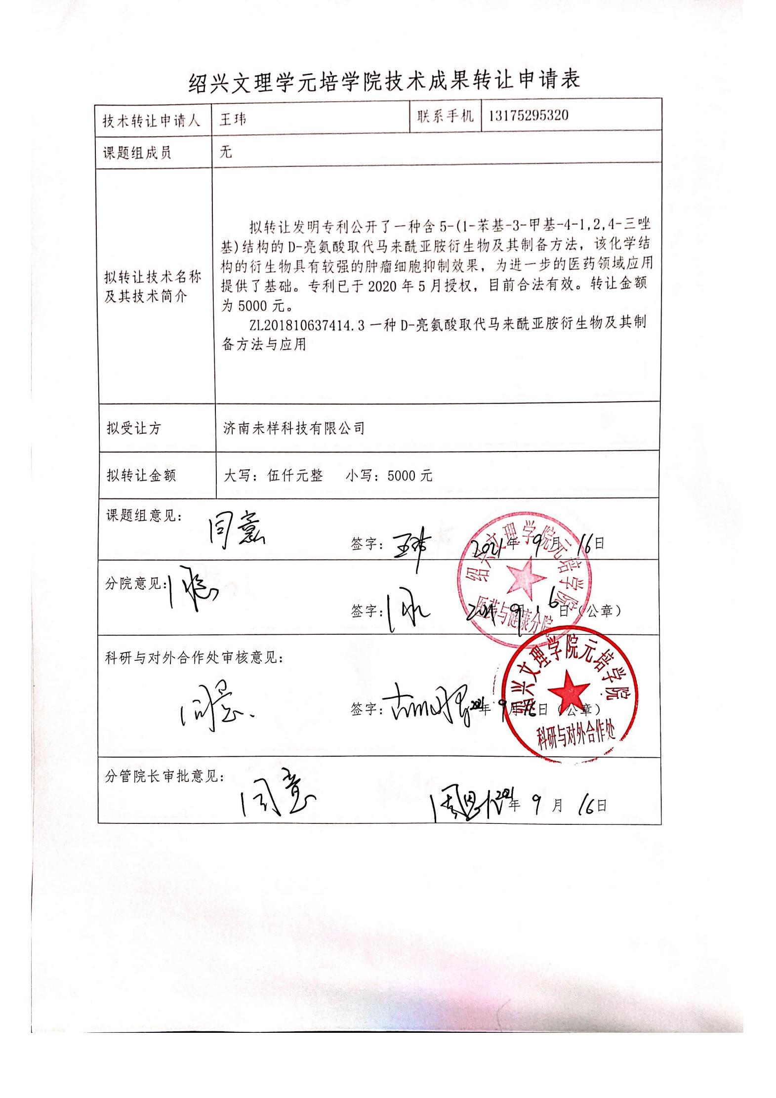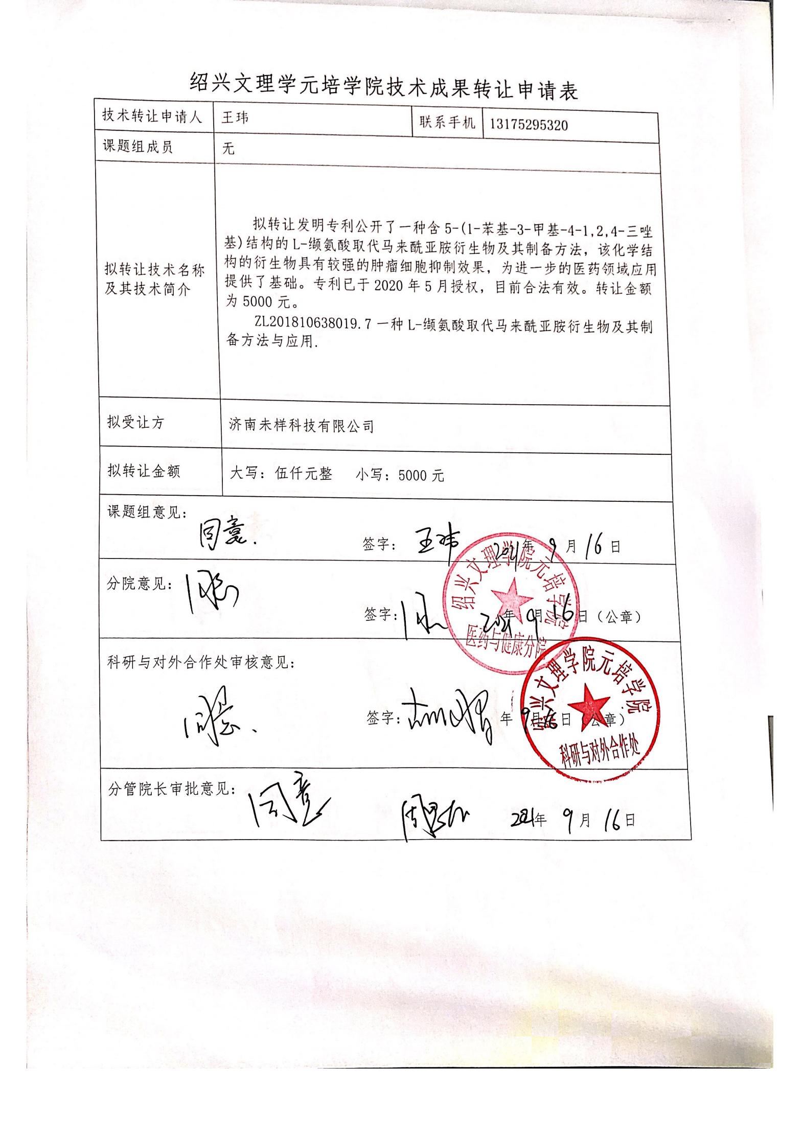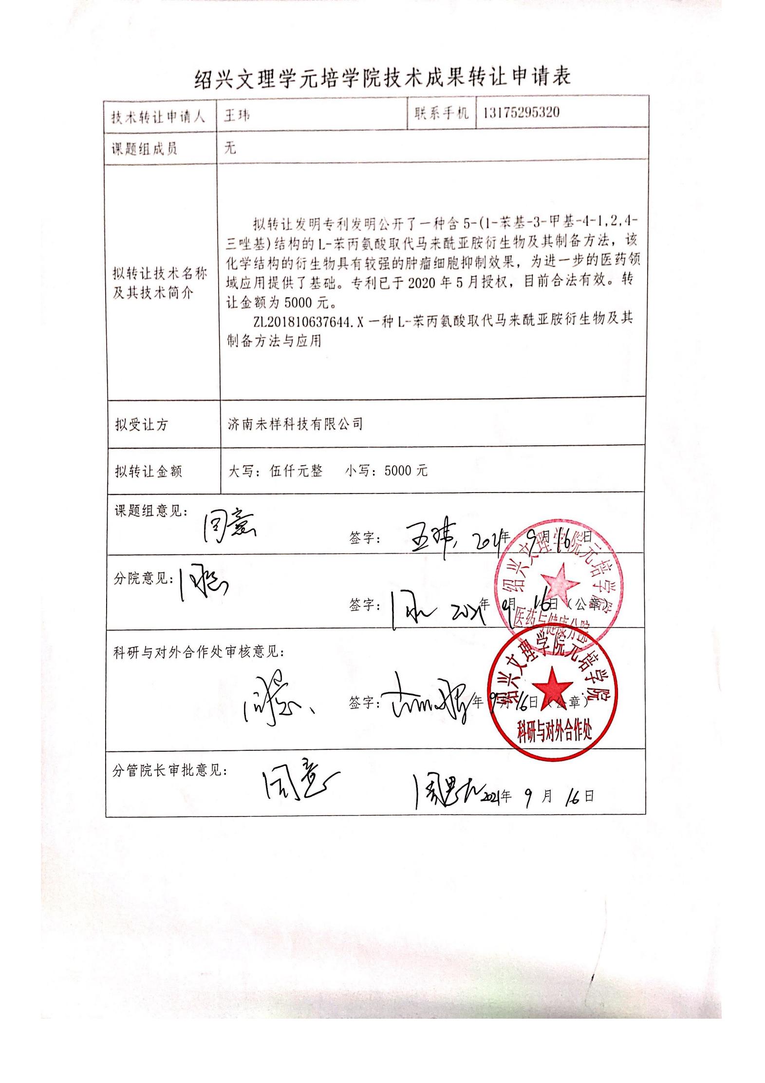 经教师申报,科研与对外合作处审核,“一种L-苯丙氨酸取代马来酰亚胺衍生物及其制备方法与应用”、“一种D-缬氨酸取代马来酰亚胺衍生物及其制备方法与应用”、“一种D-亮氨酸取代马来酰亚胺衍生物及其制备方法与应用”、“一种L-亮氨酸取代马来酰亚胺衍生物及其制备方法与应用”、“一种L-缬氨酸取代马来酰亚胺衍生物及其制备方法与应用”、“一种D-苯丙氨酸取代马来酰亚胺衍生物及其制备方法与应用、“一种对甲巯基取代含哒嗪酮结构的螺[吲哚嗪-吡唑啉]衍生物及其制备方法与应用”、“一种对氟取代含哒嗪酮结构的螺[吲哚嗪-吡唑啉]衍生物及其制备方法与应用”、“一种对甲氧基取代含哒嗪酮结构的螺[吲哚嗪-吡唑啉]衍生物及其制备方法与应用”、“一种对甲基取代含哒嗪酮结构的螺[吲哚嗪-吡唑啉]衍生物及其制备方法与应用”、“一种对氯取代含哒嗪酮结构的螺[吲哚嗪-吡唑啉]衍生物及其制备方法与应用”、“3,4,5-三甲氧基取代含哒嗪酮结构的螺[吲哚嗪-吡唑啉]衍生物及其制备方法与应用”、“一种含哒嗪酮结构的螺[吲哚嗪-吡唑啉]衍生物及其制备方法与应用”专利拟转让。内容详见附件,现予以公示,公示时间为十五天(9月17日 — 10月1日)。公示期间,如有异议,请及时与我处联系。