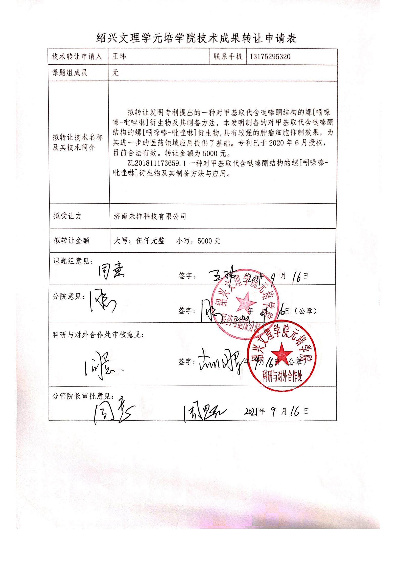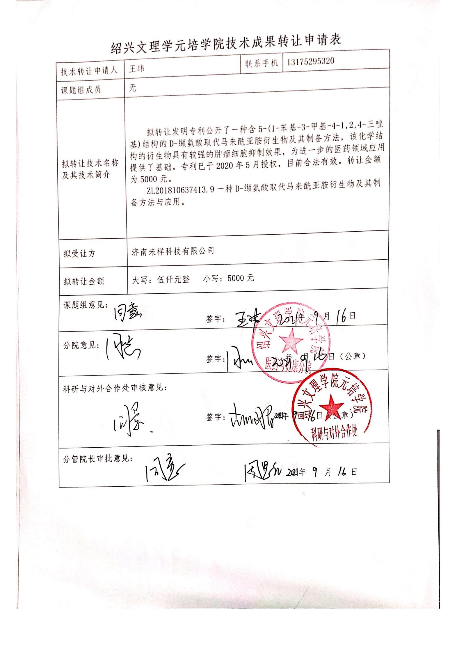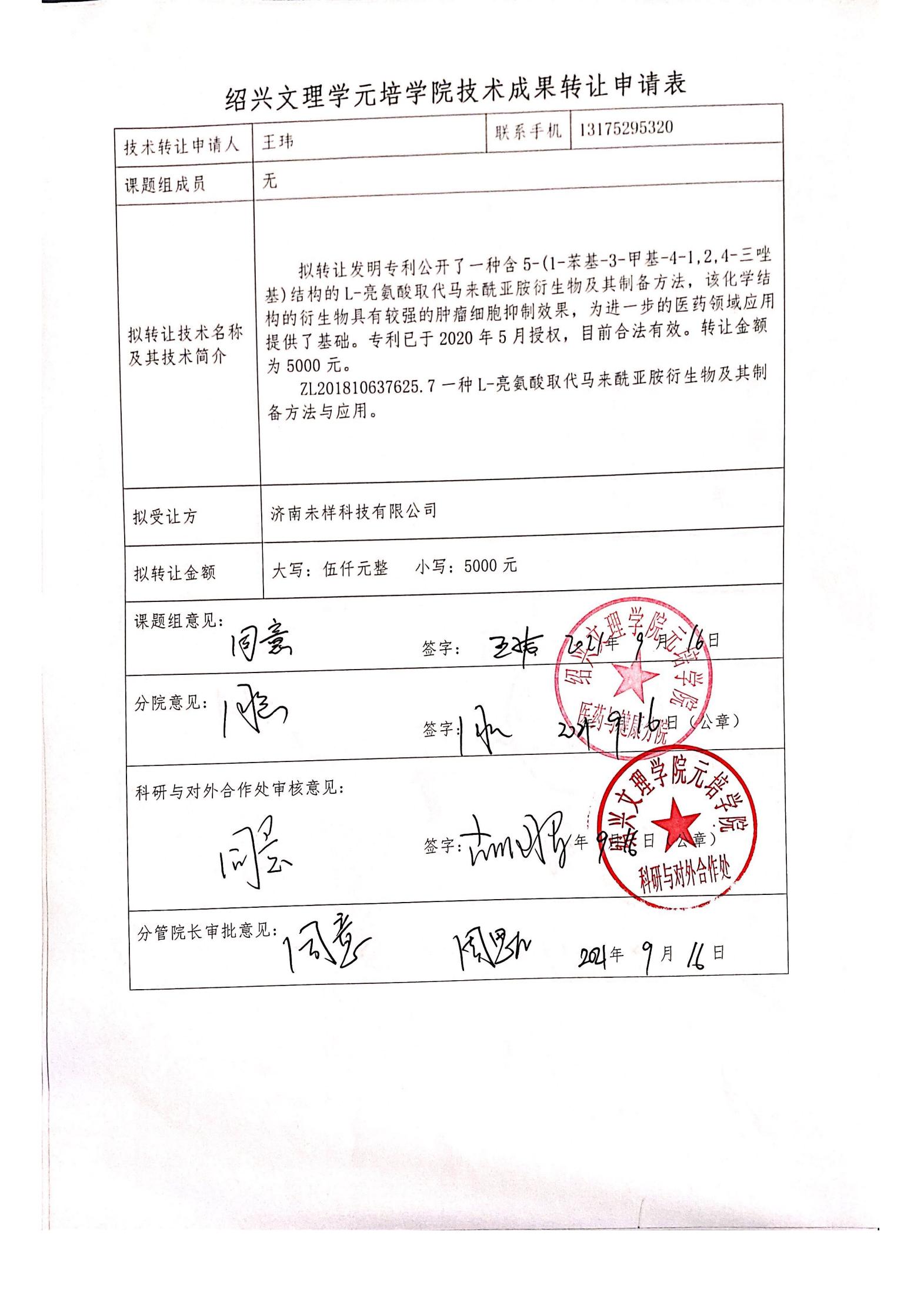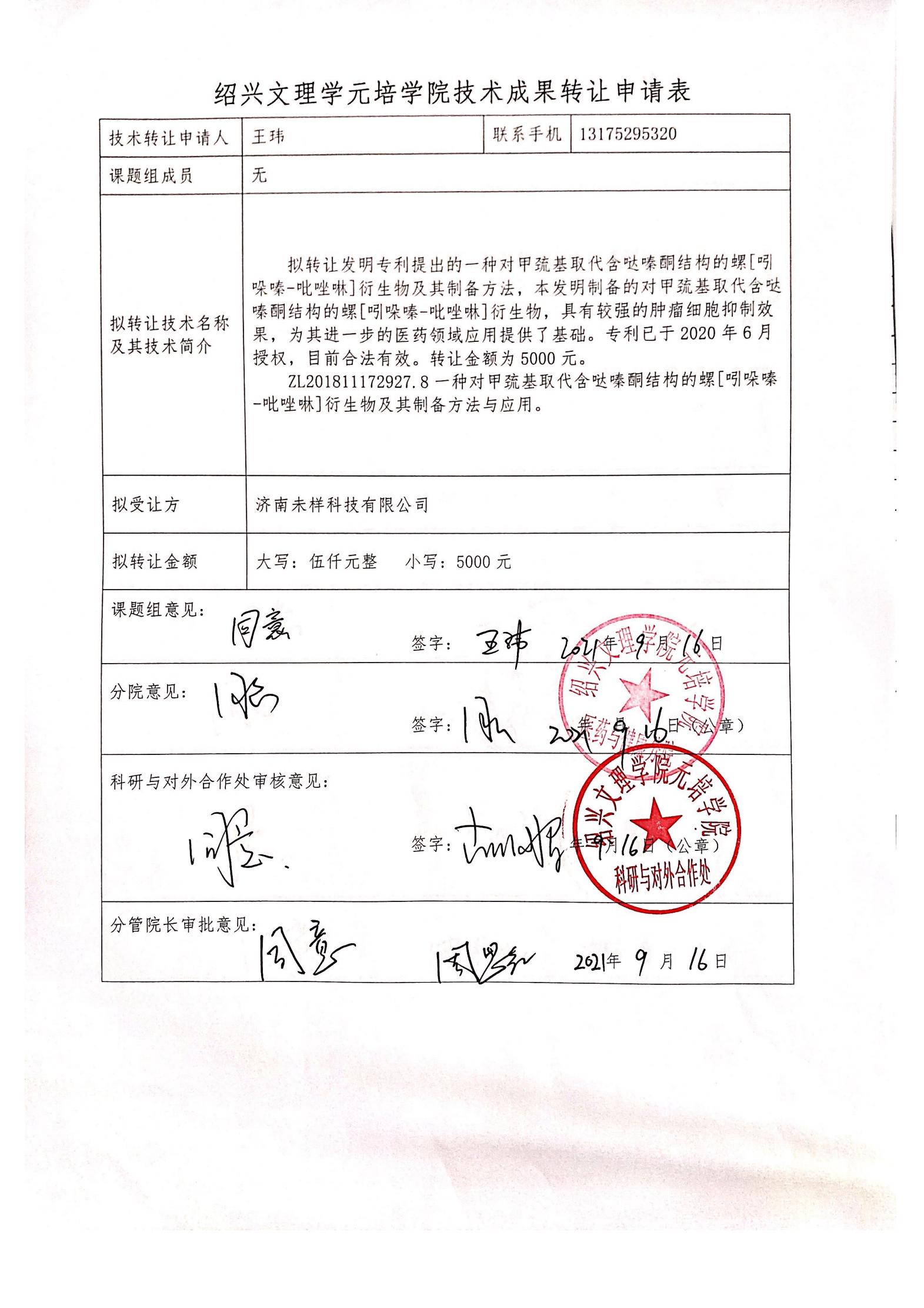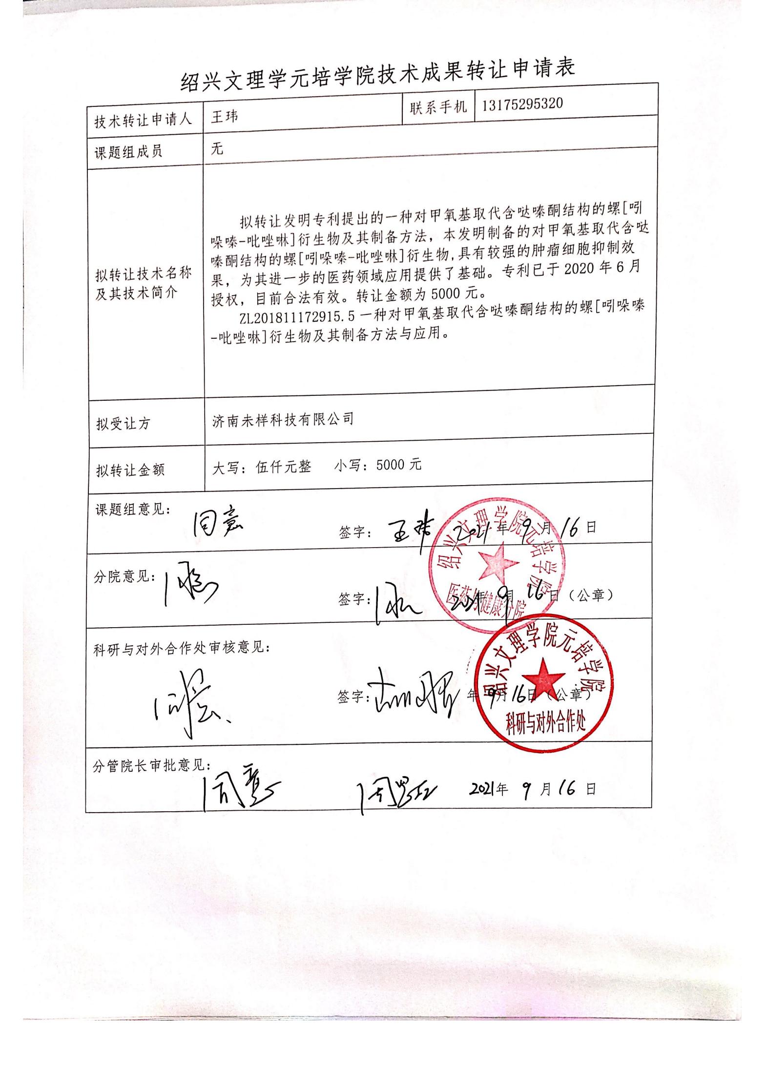经教师申报,科研与对外合作处审核,“一种L-苯丙氨酸取代马来酰亚胺衍生物及其制备方法与应用”、“一种D-缬氨酸取代马来酰亚胺衍生物及其制备方法与应用”、“一种D-亮氨酸取代马来酰亚胺衍生物及其制备方法与应用”、“一种L-亮氨酸取代马来酰亚胺衍生物及其制备方法与应用”、“一种L-缬氨酸取代马来酰亚胺衍生物及其制备方法与应用”、“一种D-苯丙氨酸取代马来酰亚胺衍生物及其制备方法与应用、“一种对甲巯基取代含哒嗪酮结构的螺[吲哚嗪-吡唑啉]衍生物及其制备方法与应用”、“一种对氟取代含哒嗪酮结构的螺[吲哚嗪-吡唑啉]衍生物及其制备方法与应用”、“一种对甲氧基取代含哒嗪酮结构的螺[吲哚嗪-吡唑啉]衍生物及其制备方法与应用”、“一种对甲基取代含哒嗪酮结构的螺[吲哚嗪-吡唑啉]衍生物及其制备方法与应用”、“一种对氯取代含哒嗪酮结构的螺[吲哚嗪-吡唑啉]衍生物及其制备方法与应用”、“3,4,5-三甲氧基取代含哒嗪酮结构的螺[吲哚嗪-吡唑啉]衍生物及其制备方法与应用”、“一种含哒嗪酮结构的螺[吲哚嗪-吡唑啉]衍生物及其制备方法与应用”专利拟转让。内容详见附件,现予以公示,公示时间为十五天(9月17日 — 10月1日)。公示期间,如有异议,请及时与我处联系。