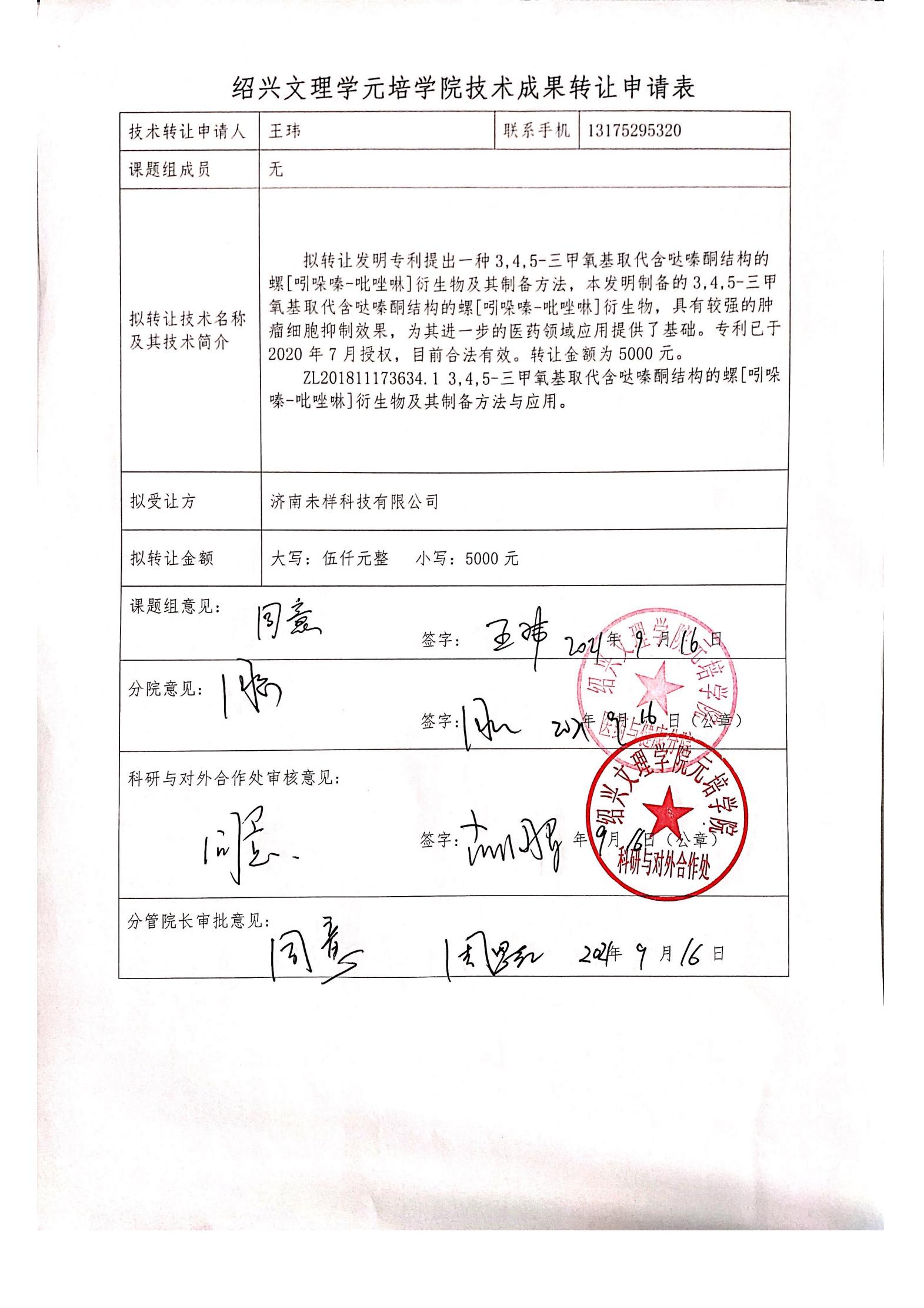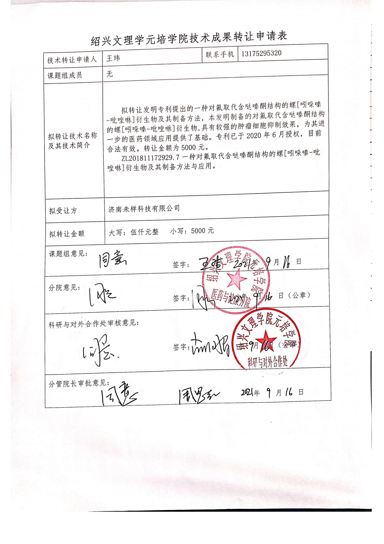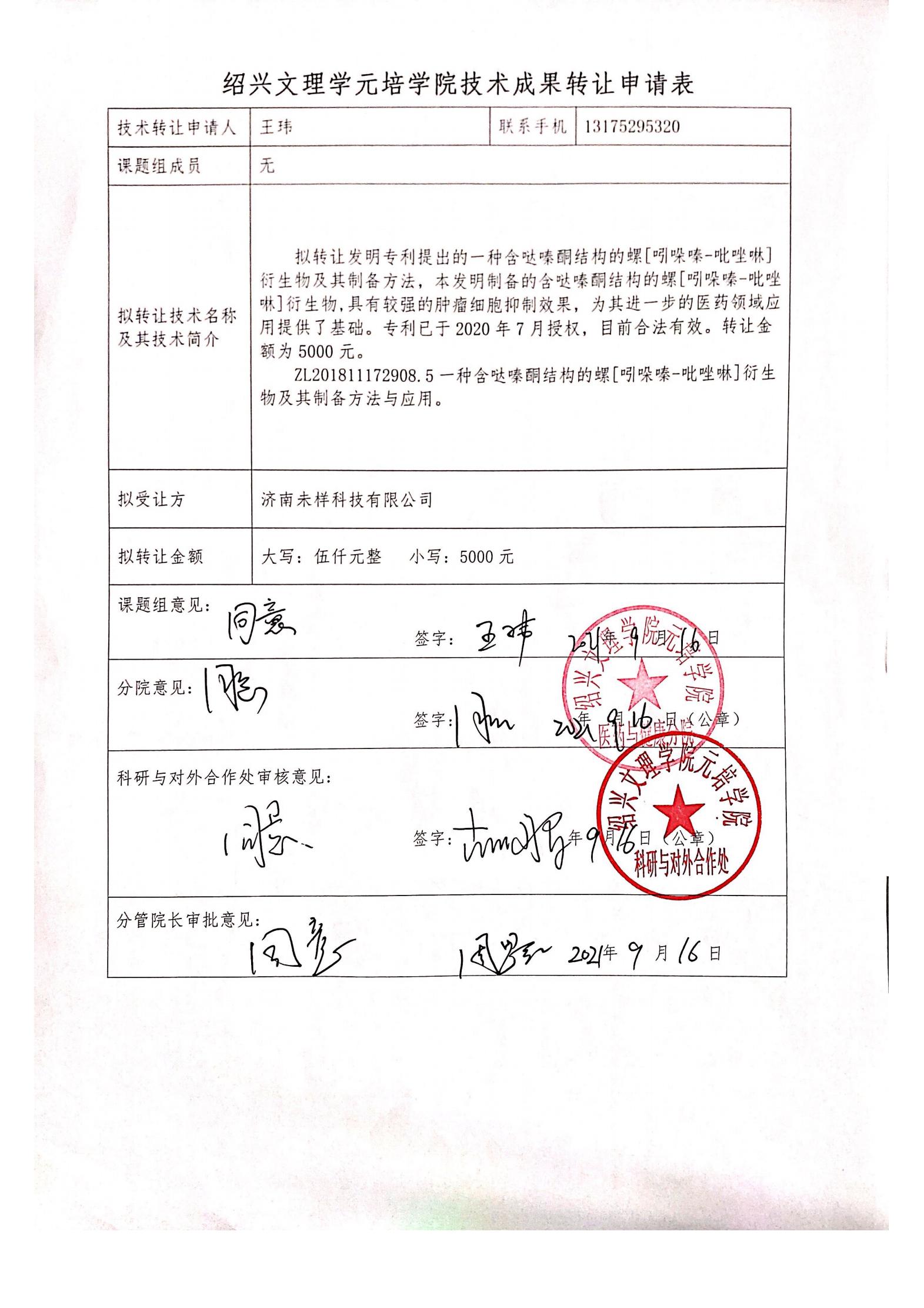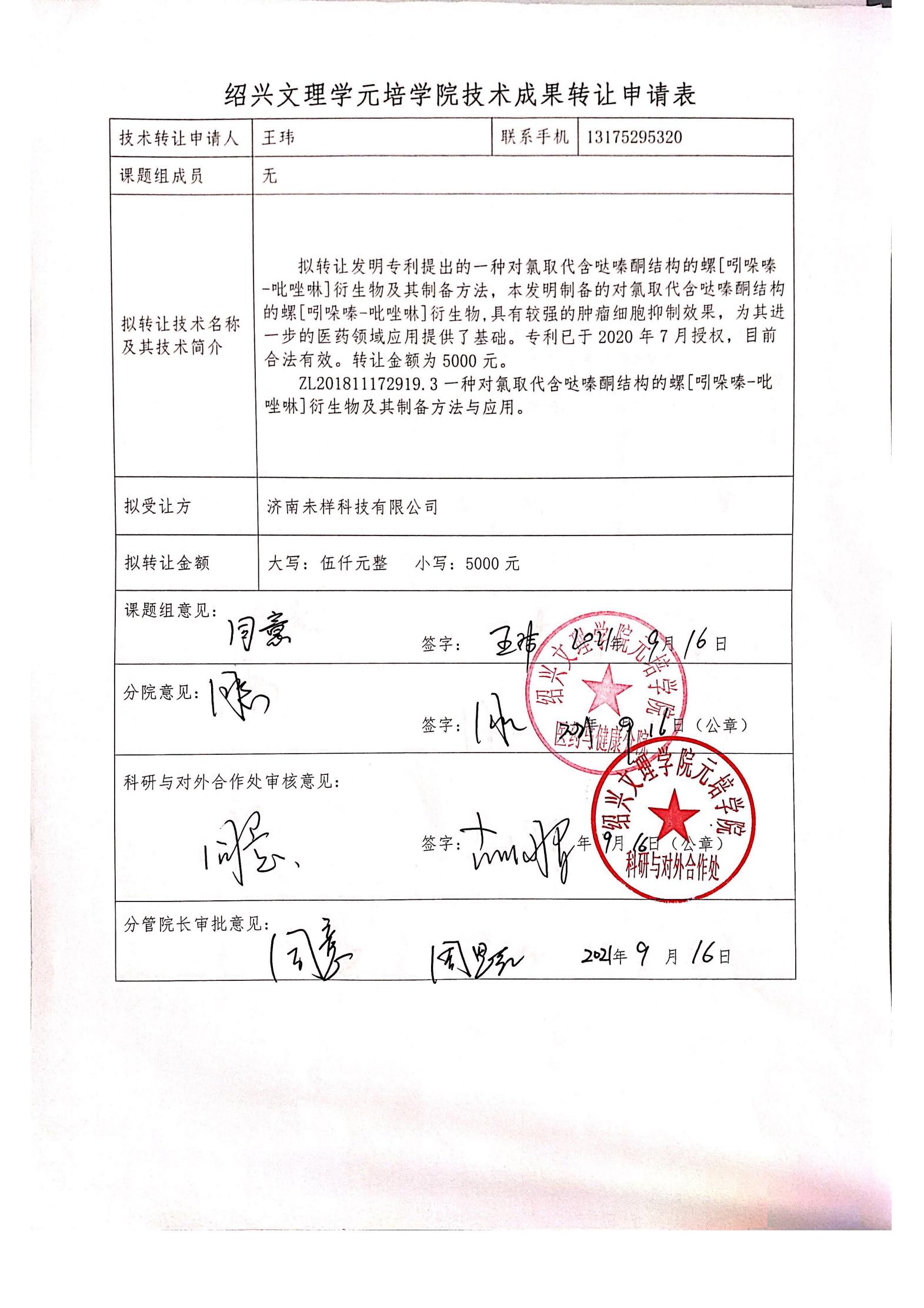 经教师申报,科研与对外合作处审核,“一种L-苯丙氨酸取代马来酰亚胺衍生物及其制备方法与应用”、“一种D-缬氨酸取代马来酰亚胺衍生物及其制备方法与应用”、“一种D-亮氨酸取代马来酰亚胺衍生物及其制备方法与应用”、“一种L-亮氨酸取代马来酰亚胺衍生物及其制备方法与应用”、“一种L-缬氨酸取代马来酰亚胺衍生物及其制备方法与应用”、“一种D-苯丙氨酸取代马来酰亚胺衍生物及其制备方法与应用、“一种对甲巯基取代含哒嗪酮结构的螺[吲哚嗪-吡唑啉]衍生物及其制备方法与应用”、“一种对氟取代含哒嗪酮结构的螺[吲哚嗪-吡唑啉]衍生物及其制备方法与应用”、“一种对甲氧基取代含哒嗪酮结构的螺[吲哚嗪-吡唑啉]衍生物及其制备方法与应用”、“一种对甲基取代含哒嗪酮结构的螺[吲哚嗪-吡唑啉]衍生物及其制备方法与应用”、“一种对氯取代含哒嗪酮结构的螺[吲哚嗪-吡唑啉]衍生物及其制备方法与应用”、“3,4,5-三甲氧基取代含哒嗪酮结构的螺[吲哚嗪-吡唑啉]衍生物及其制备方法与应用”、“一种含哒嗪酮结构的螺[吲哚嗪-吡唑啉]衍生物及其制备方法与应用”专利拟转让。内容详见附件,现予以公示,公示时间为十五天(9月17日 — 10月1日)。公示期间,如有异议,请及时与我处联系。