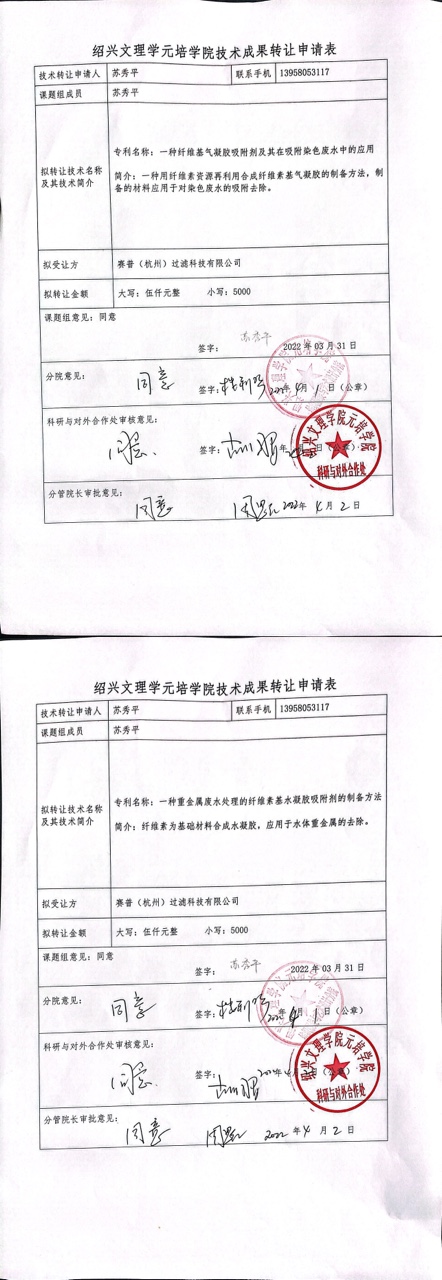 经教师申报,科研与对外合作处审核,“一种用于重金属废水处理的纤维素基水凝胶吸附剂的制备方法、一种纤维基气凝胶吸附剂及其在吸附染色废水中的应用”专利拟转让。内容详见附件,现予以公示,公示时间为十五天(4月2日 — 4月 16日)。公示期间,如有异议,请及时与我处联系。