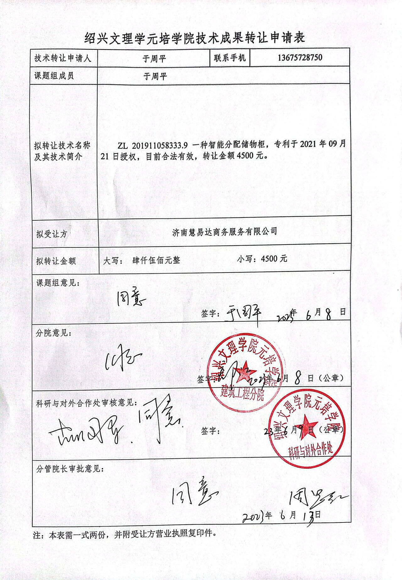 经教师申报,科研与对外合作处审核,“一种智能分配储物柜”发明专利拟转让。内容详见附件,现予以公示,公示时间为十五天(6月13日 — 6月27日)。公示期间,如有异议,请及时与我处联系。