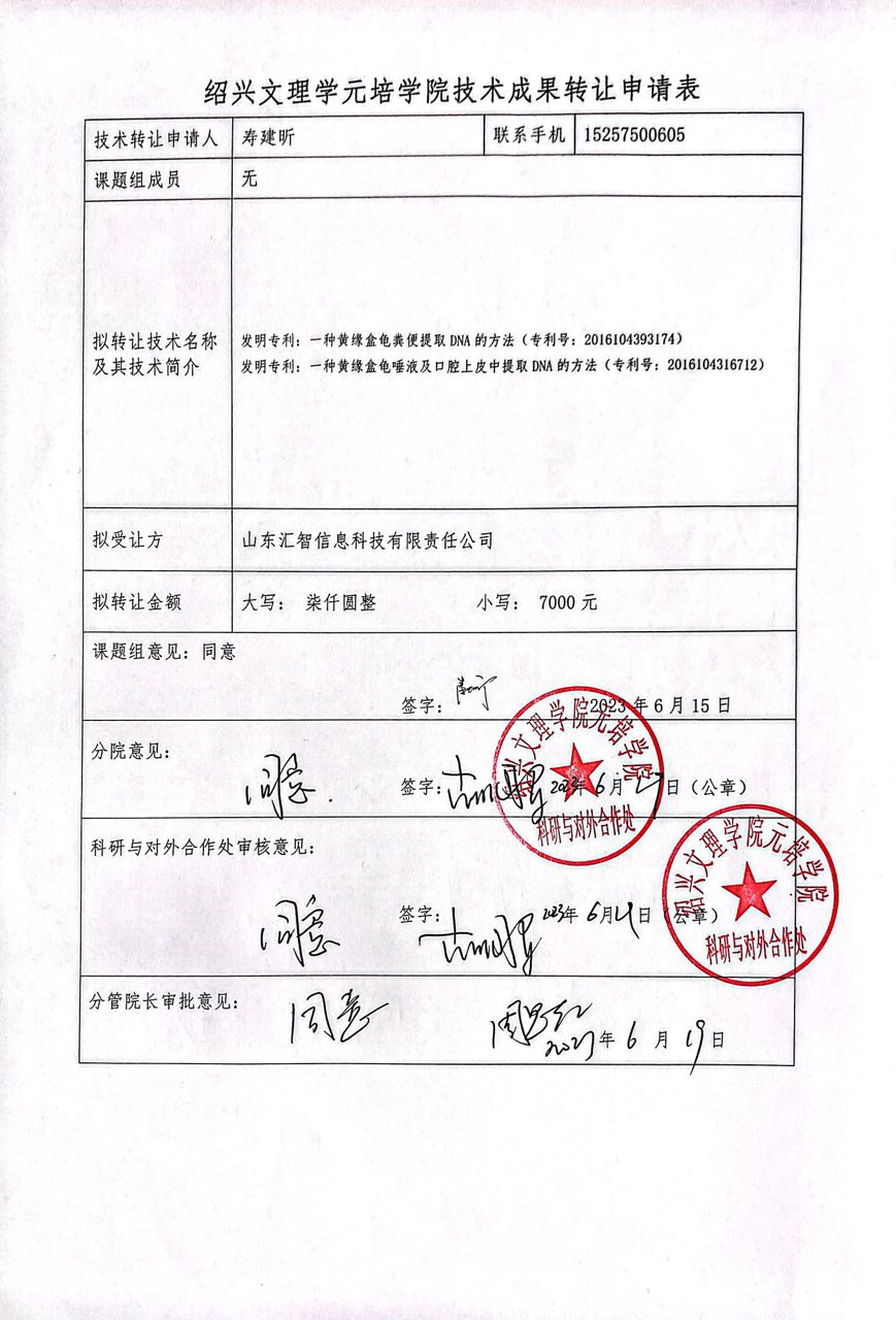 经教师申报,科研与对外合作处审核,“一种黄缘盒龟粪便提取DNA的方法”、“一种黄缘盒龟唾液及口腔上皮中提取DNA的方法”发明专利拟转让。内容详见附件,现予以公示,公示时间为十五天(6月19日 — 7月3日)。公示期间,如有异议,请及时与我处联系。