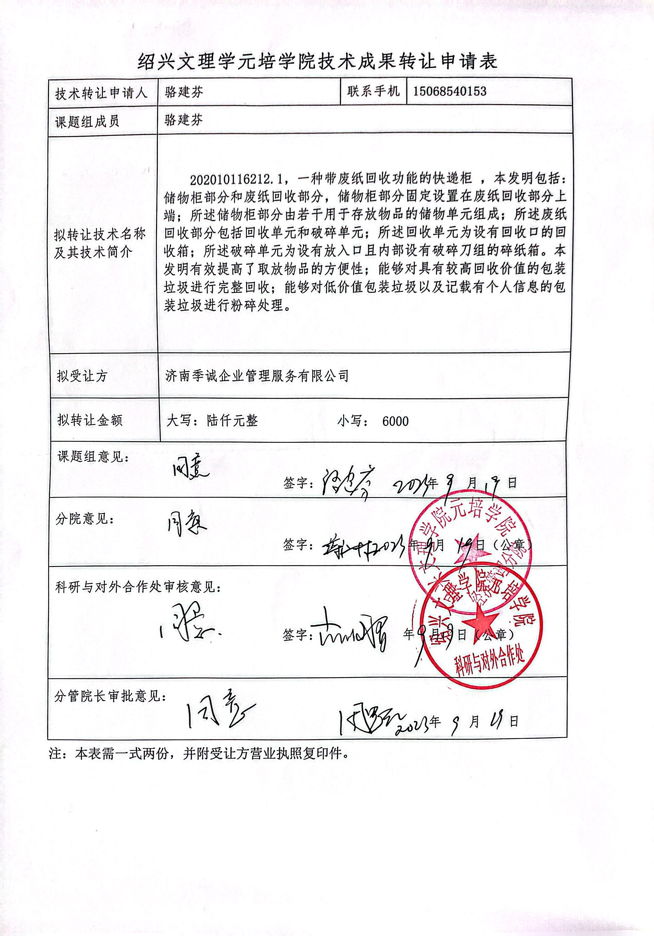 经教师申报,科研与对外合作处审核,“一种带废纸回收功能的快递柜”发明专利拟转让。内容详见附件,现予以公示,公示时间为十五天(9月20日 — 10月4日)。公示期间,如有异议,请及时与我处联系。