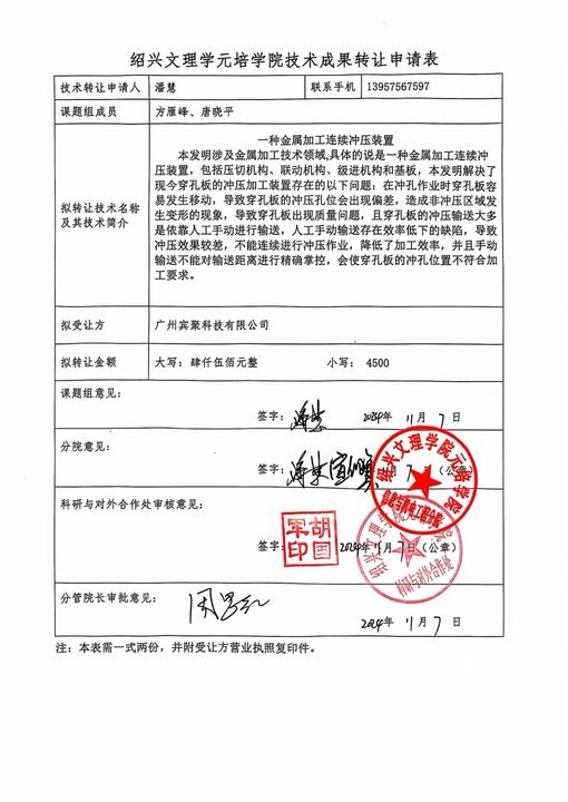 经教师申报,科研与对外合作处审核,“一种金属加工连续冲压装置”专利拟转让。内容详见附件,现予以公示,公示时间为十五天(11月8日 — 11月22日)。公示期间,如有异议,请及时与我处联系。