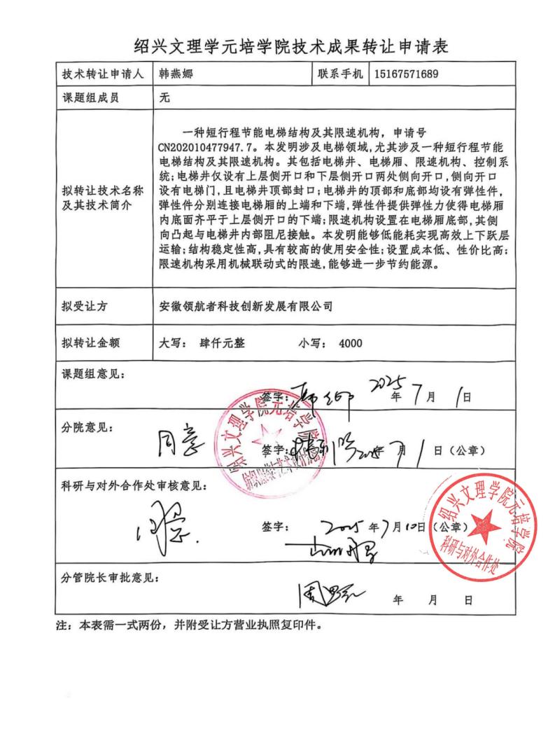 经教师申报,科研与对外合作处审核,“一种短行程节能电梯结构及其限速机构”专利拟转让。内容详见附件,现予以公示,公示时间为十五天(2025年7月10日 —2025年 7月24日)。公示期间,如有异议,请及时与我处联系。